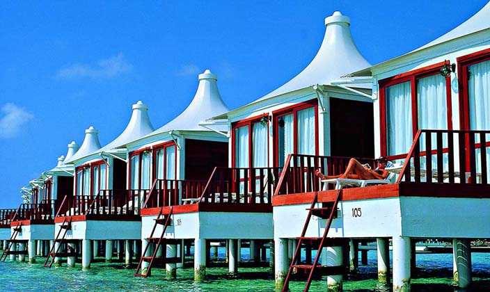 馬爾代(dai)夫以(yi)水上屋聞名(míng)世界,而哈庫拉島也(ye)憑借它帳篷式(shi)的(de)水上屋名(míng)揚馬代(dai)。一(yi)旦您步入這箇(ge)島嶼,您便可(kě)以(yi)看到(dao)這一(yi)排(pai)排(pai)水上的(de)房屋連着島嶼的(de)東部(bu)邊緣。水上房屋僅離沙灘幾米遠(yuǎn),成(cheng)排(pai)的(de)形狀設(shè)計(ji),給人(ren)一(yi)種超乎想象的(de)美觀感。