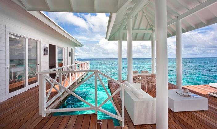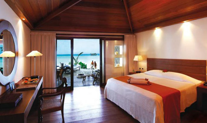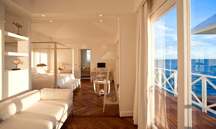 水上别墅全都擁有(yǒu)私人(ren)露檯(tai),可(kě)直接通(tong)向水中(zhong)。别墅中(zhong)精(jīng)緻的(de)傢(jia)具(ju)擺設(shè)布滿整箇(ge)空間,包括藤製(zhi)傢(jia)具(ju),意大(da)利當代(dai)燈飾咊(he)手工(gong)鑲的(de)木(mù)質(zhi)樓梯,使客人(ren)在(zai)假期中(zhong)實現(xian)夢幻度假的(de)感受。