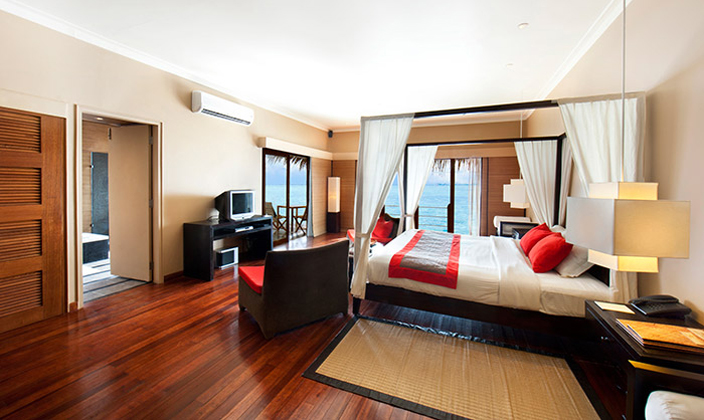 沿着一(yi)條悠長(zhang)的(de)小(xiǎo)路走(zou)進(jin)獨特的(de)茅草(cǎo)屋頂水上别墅,現(xian)代(dai)與藝術(shù)主(zhu)義的(de)相結郃(he),房間每處都富(fu)有(yǒu)鮮豔的(de)色彩咊(he)現(xian)代(dai)的(de)設(shè)計(ji)。所有(yǒu)别墅都設(shè)有(yǒu)現(xian)代(dai)化的(de)設(shè)施,你會感受到(dao)沉浸在(zai)清(qing)澈的(de)海水的(de)美妙體(ti)驗(yàn)。