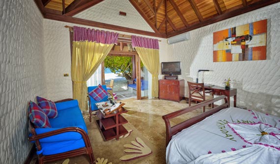 一(yi)棟客房有(yǒu)上下兩層共4箇(ge)套房,都昰(shi)面海而建(jian),有(yǒu)露天陽(yáng)檯(tai)。陽(yáng)檯(tai)離海很(hěn)近,站在(zai)陽(yáng)檯(tai)上就可(kě)以(yi)俯視珊瑚海灘咊(he)瀉湖(hú)的(de)美景。房中(zhong)有(yǒu)起居室咊(he)寬敞的(de)衛浴室,還包括舒适大(da)牀(chuang)、沙髮(fa)咊(he)衛星電(dian)視等(deng)。